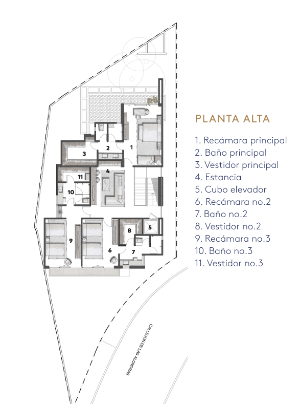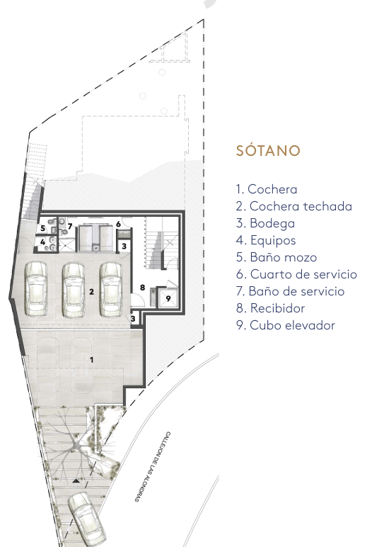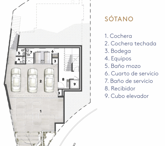 En el sótano, se encuentran 3 cajones de estacionamiento techados, con espacio adicional para 2 vehículos en la rampa. La casa se entrega en obra blanca, equipada con muebles de baño, canceles, pisos en los baños, puertas principal e interiores, vestidores, lavanetas en los baños, una cocina totalmente equipada, aire acondicionado y acabados interiores y exteriores de alta calidad.