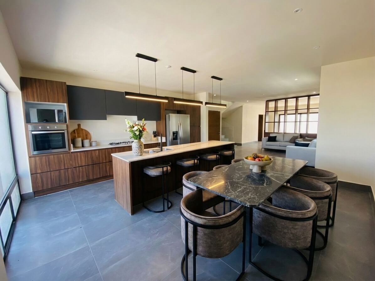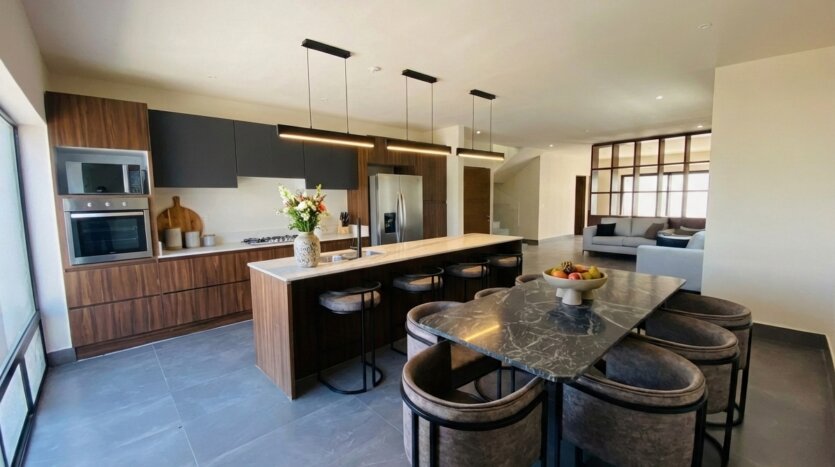 Cocina integral equipada con campana, mesa de trabajo con tarja de acero inoxidable y cubiertas de mármol.