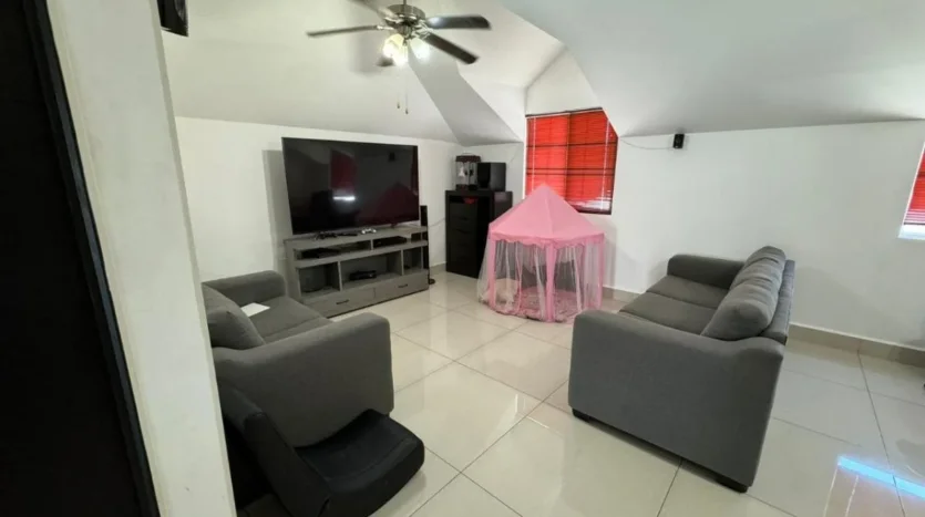 Espacio versátil para estancia de juegos, sala TV, ideal para home office, estudio o gimnasio, y una terraza techada con vista frontal a la montaña, equipada con barra de cerámico, fregadero y parrilla de gas. Baño completo en este nivel.