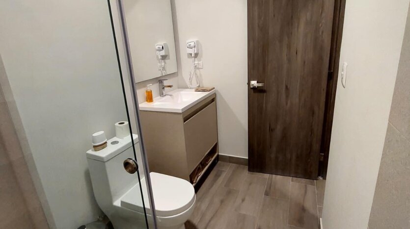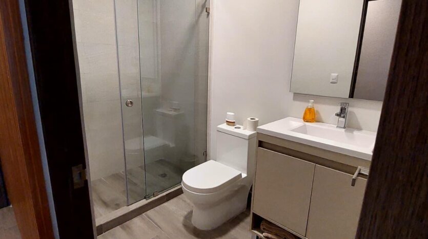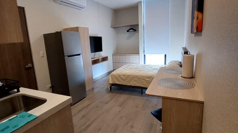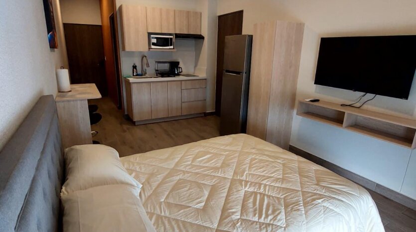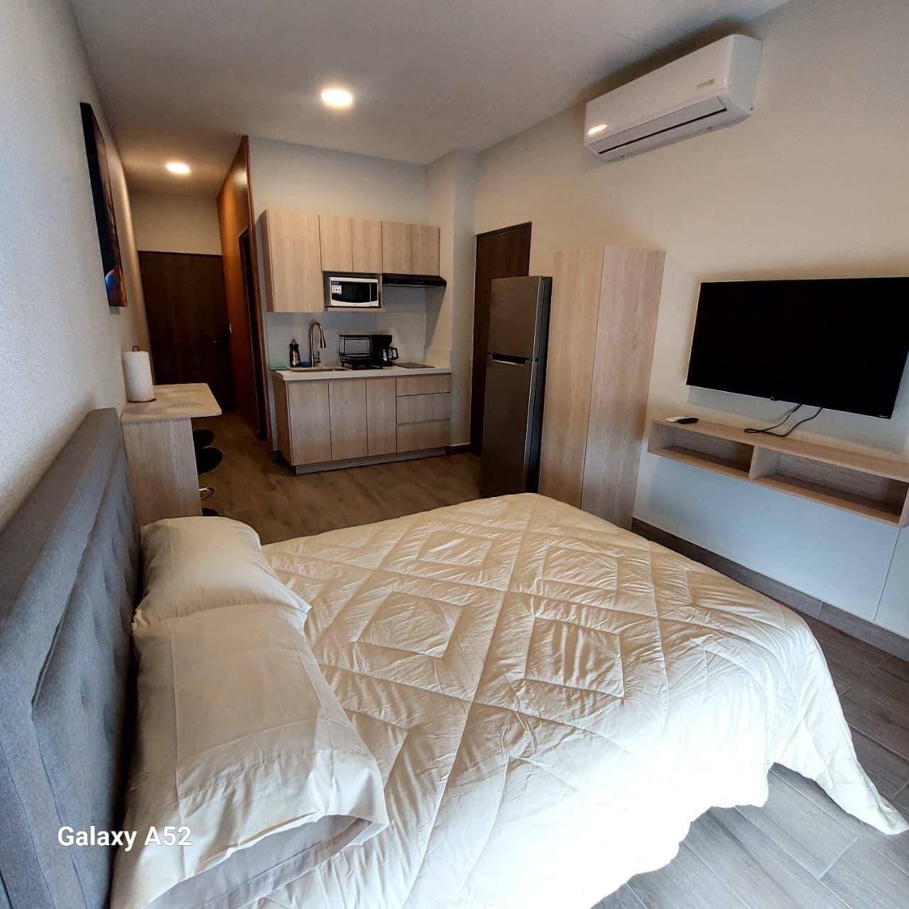 Una recámara, área de cocina, sala, comedor y baño completo.